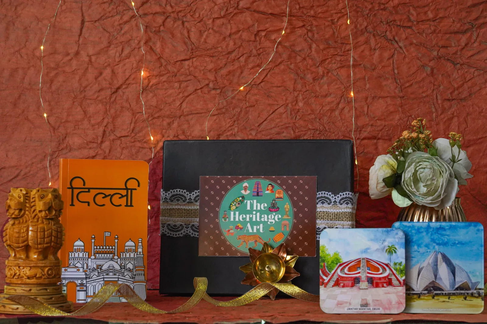 Explore the rich heritage of Delhi with our “Delhi in a Box” collection, a perfect blend of culture and craftsmanship. This exquisite set features a handcarved wooden Ashok Stambh tabletop, measuring 5 inches, symbolizing the strength of India’s heritage. Capture your thoughts and experiences in the beautifully designed Delhi city diary, complemented by a set of two coasters that add a touch of elegance to your space. The brass diya brings warmth and prosperity to your home. All items are thoughtfully packaged in a gift box, complete with a greeting card, making it an ideal gift for any occasion or a cherished keepsake for yourself.