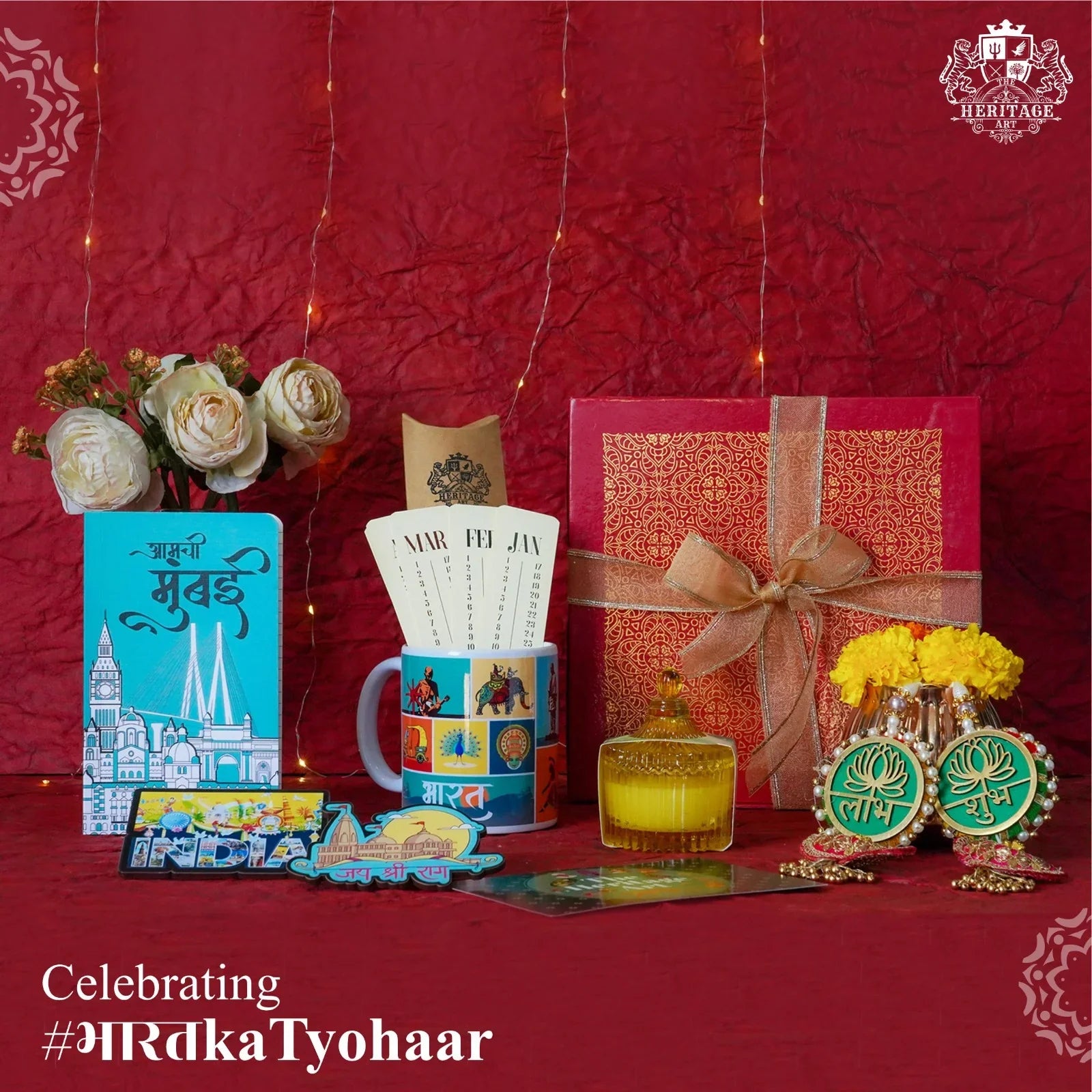 Contents – Varanasi Jar Candle + India Mug + India Magnets (set of 2) + Mumbai City Diary + Heritage City Bookmarks cum Universal Calendar set + Shubh Labh Wall Hanging + Premium Gift Box + Diwali Card.