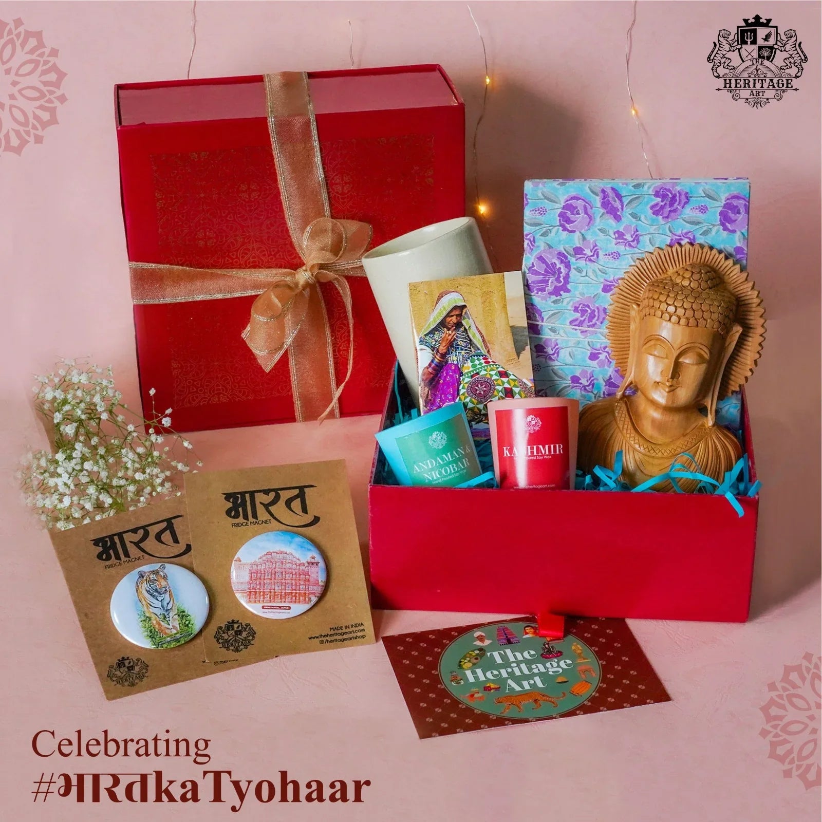 Behold the divine allure of India in a Box – a sacred ensemble of Wooden Buddha Sculpture, Ceramic Tumbler Vase, India Votive Candles, Magnets, Handmade Paper Diary, nestled in a Red Gift Box adorned with a Diwali Card. Embrace the legacy of artisans, each piece a testament to India’s timeless beauty and wisdom. Behold the splendor of India encapsulated in a meticulously curated treasure trove – the “India in a Box” Souvenirs & Wellness Gift Hamper. This exquisite offering is a harmonious symphony of artistry, tradition, and reverence for the rich tapestry of Indian heritage.