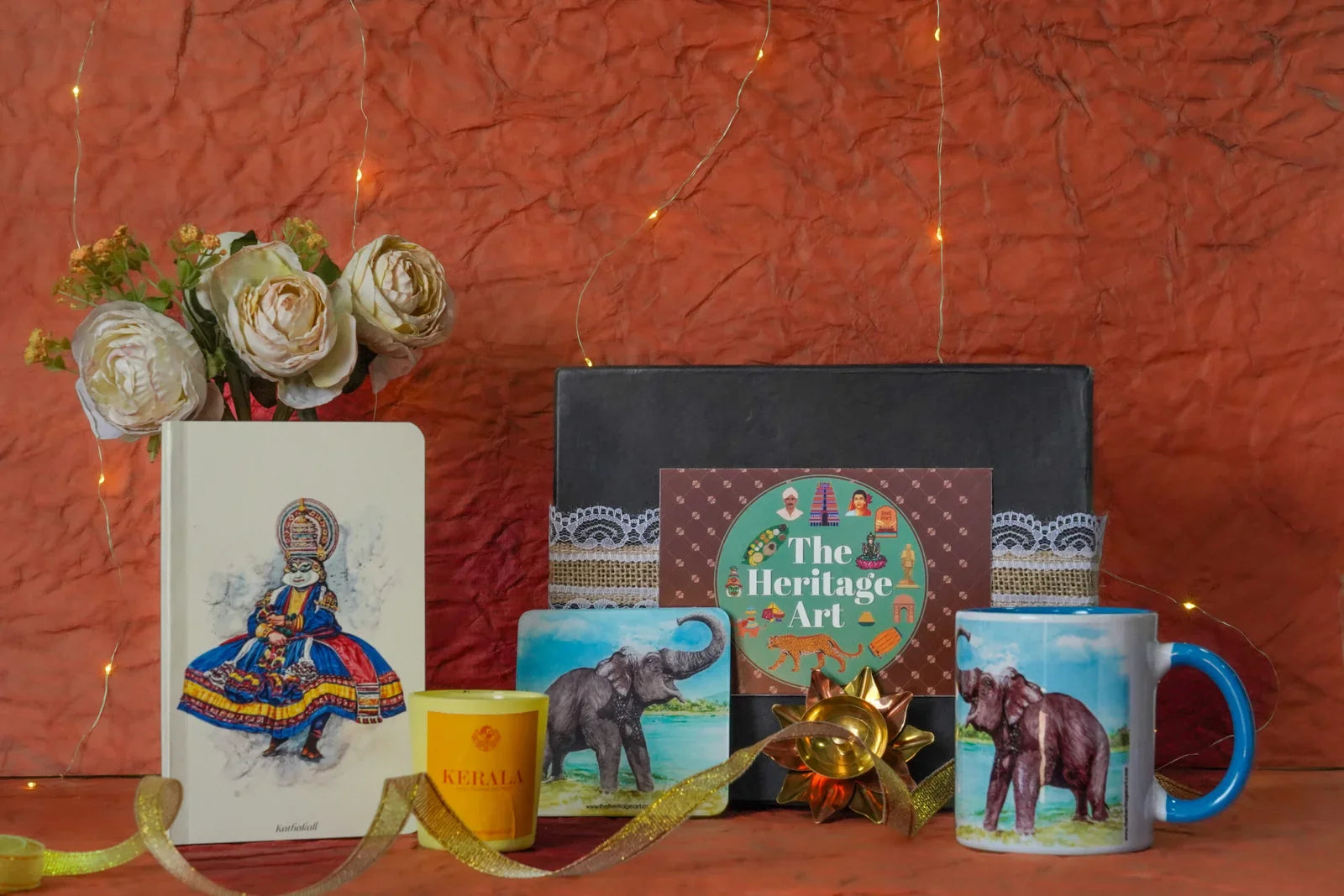 Discover the essence of Kerala with “Kerala in a Box,” a curated collection of exquisite souvenirs. This charming set includes a soothing Kerala votive candle, a beautifully illustrated city diary for your thoughts, a stylish coffee mug with a matching coaster, and a stunning brass diya symbolizing prosperity. All items are elegantly presented in a gift box, making it a perfect present for any occasion. To top it off, a lovely greeting card allows you to share a heartfelt message. Bring home the vibrant culture and tranquility of Kerala with this delightful assortment, ideal for gifting or personal enjoyment.