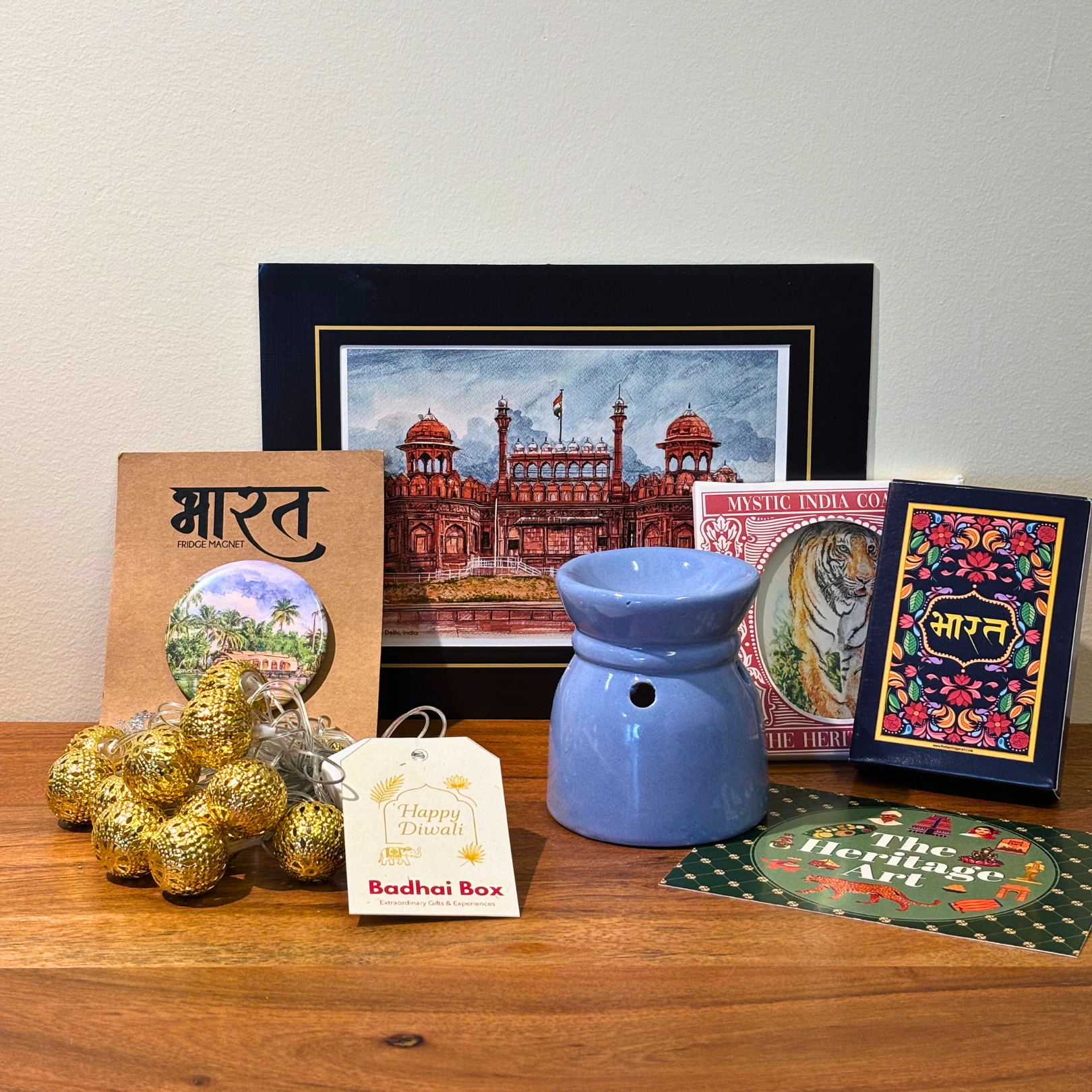 A pocket-sized passport to India’s soul, the Mini Bharat Box is a collector’s dream and a gifter’s delight. Curated with love from every corner of the country, it features heritage-inspired playing cards, handcrafted magnets, fairy lights from the East, a majestic Red Fort artprint, and more. Packed in a charming gift box with a custom note, this box turns culture into joy.