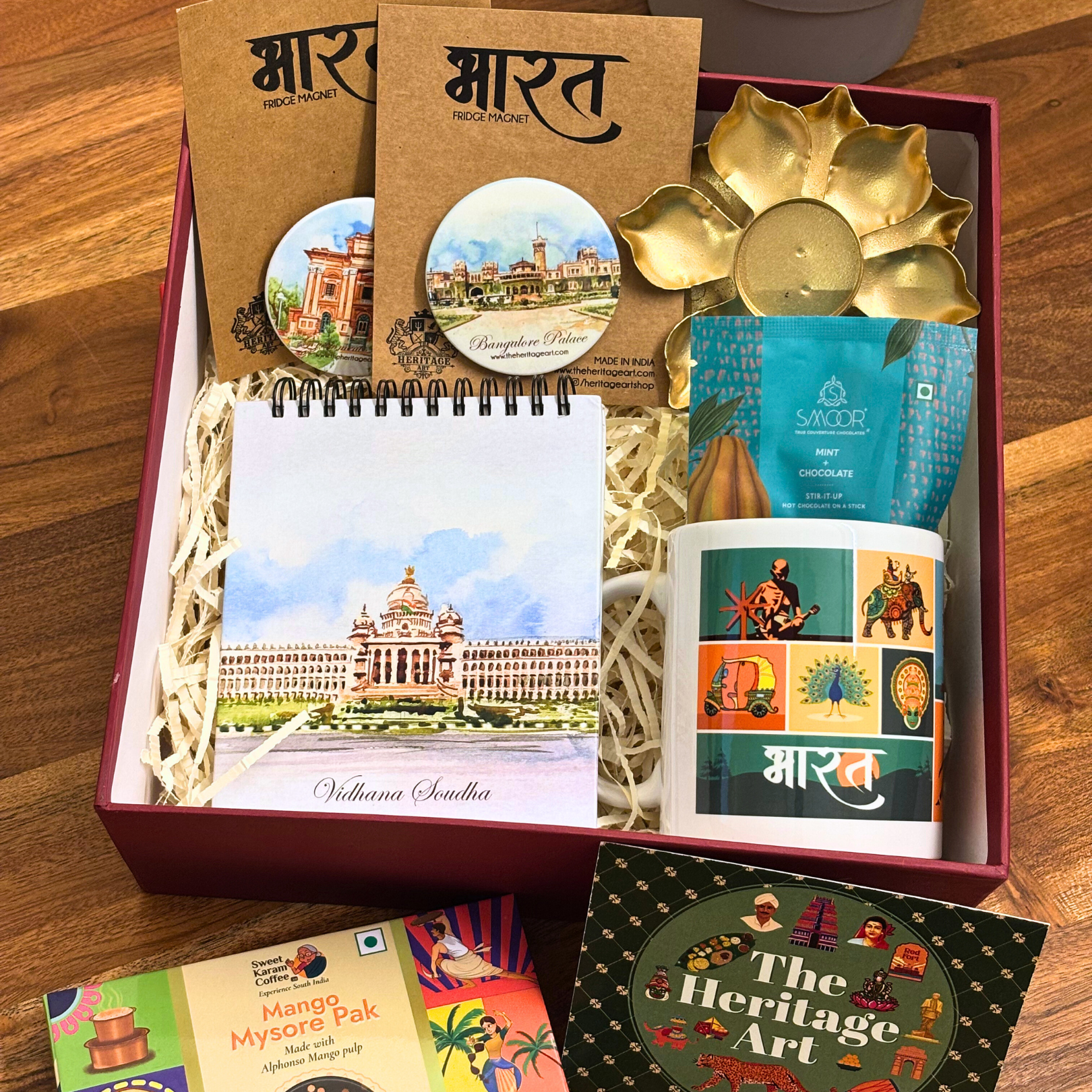 Inspired by the charm, color, and cosmopolitan energy of Bangalore, the Namma Bengaluru Box brings together handcrafted keepsakes, local flavours, and city pride. From Mysore Pak to Vidhan Soudha art and handpainted magnets, this box celebrates the best of South India’s coolest city.