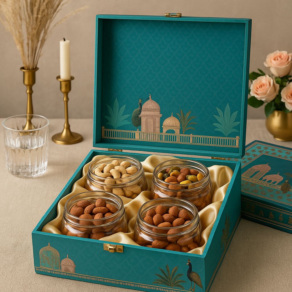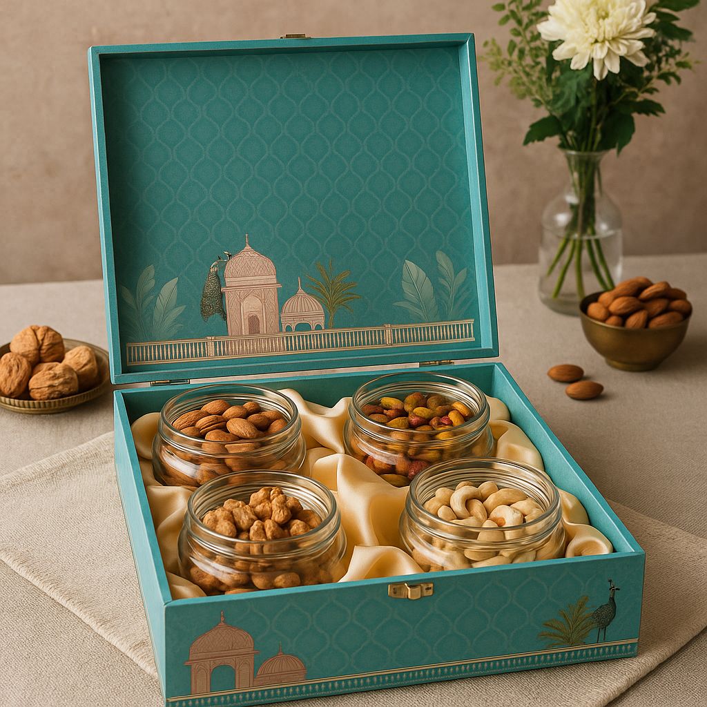 Elevate your gifting game with the Wooden Cultural Box, a handcrafted treasure of taste and tradition. This elegant wooden box holds 4 glass jars β each filled with a thoughtful gourmet selection, blending rich Indian flavours with a premium aesthetic.