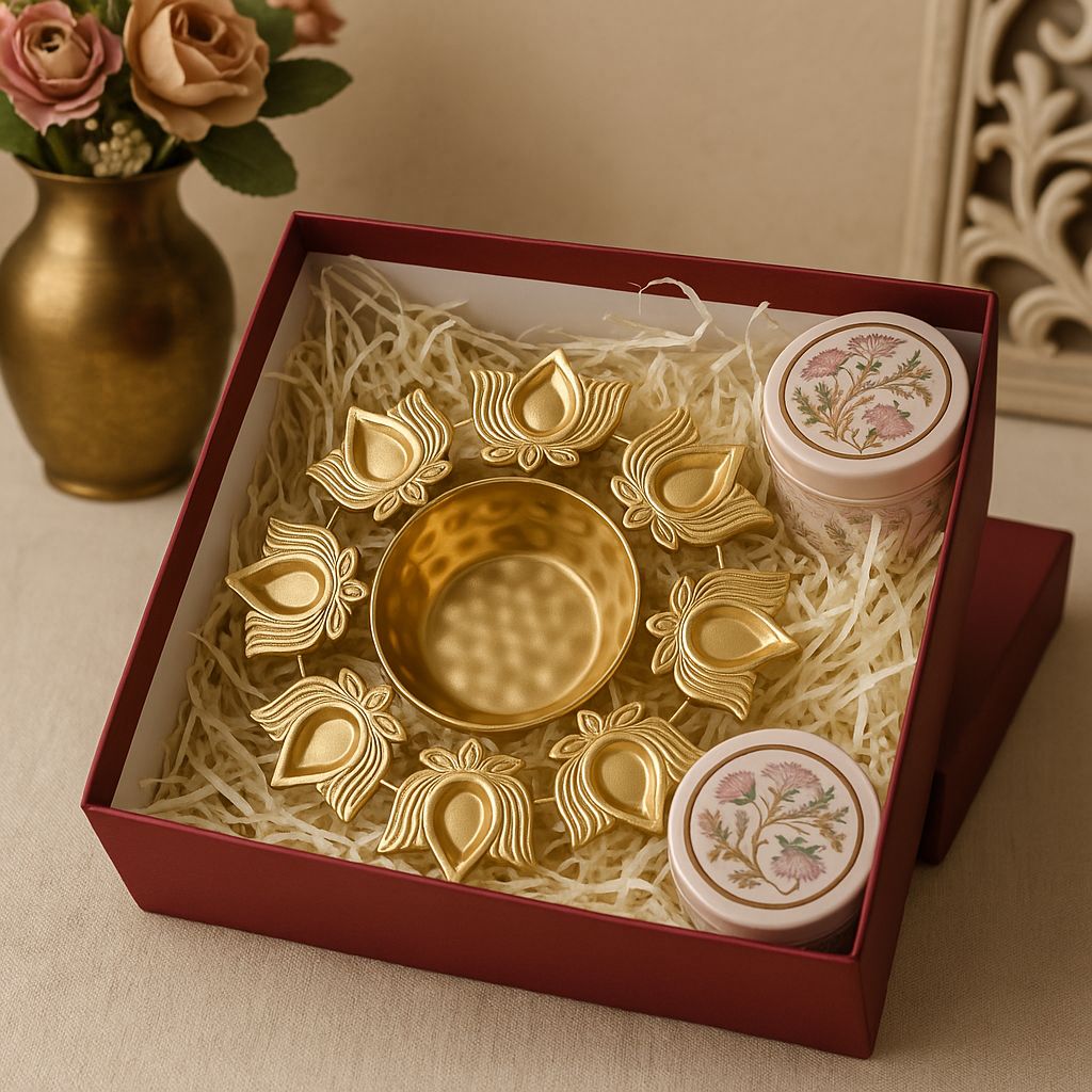 Celebrate the timeless charm of Indian festivals with the Riwaayat Gift Box, a curated ensemble that blends heritage, indulgence, and craftsmanship. Centered around the graceful brass urli — a symbol of abundance and warmth — this hamper brings together culture and class in every detail.